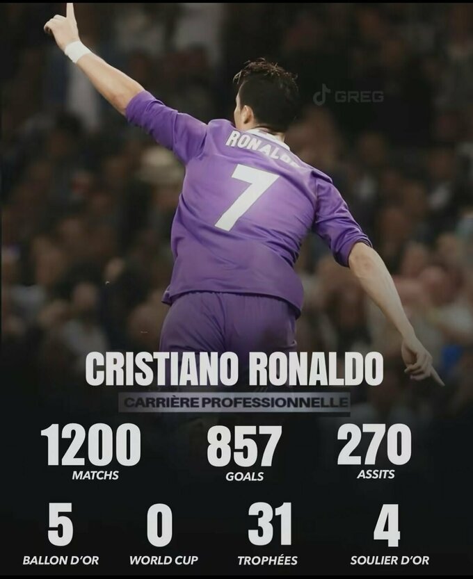 38-летний португальский футболист в течение карьеры играл за 7 команд: «Спортинг» Б (2 матча, 0 голов), «Спортинг» (31 матч, 5 голов), «Манчестер Юнайтед» (346 матчей, 145 голов), «Реал» Мадрид (438 матчей, 450 голов), «Ювентус» (134 матча, 101 гол), «Аль-Наср» (44 матча, 38 голов) и национальная сборная Португалии (205 матчей, 128 голов).