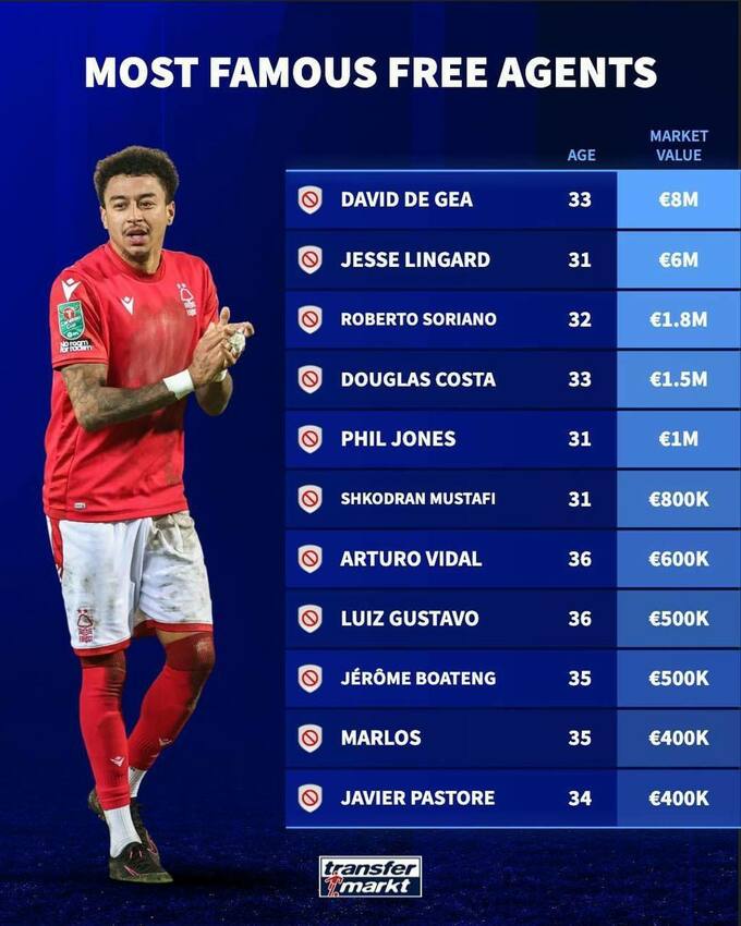 Веб-портал Transfermarkt опубликовал трансферные стоимости игроков без клуба.