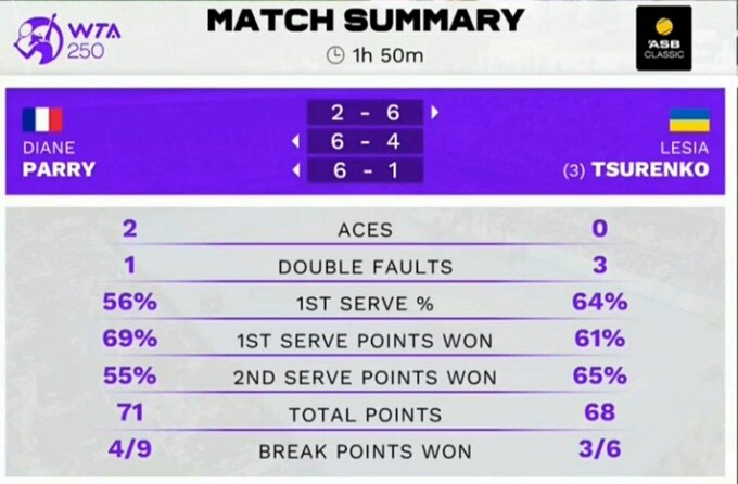 Украинская теннисистка Леся Цуренко (WTA 32) завершила выступления на хардовом турнире WTA 250 в Окленде (Новая Зеландия).
