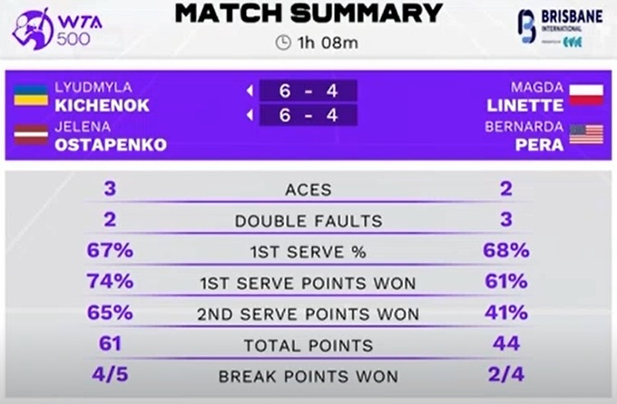 В 1/4 финала украинка и Алена Остапенко из Латвии, посеянные под пятым номером, переиграли Магду Линетт и Бернарду Перу (Польша/США).