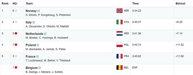 Сандер Айтрем, Педер Кунгсхауг и Сверре Люнде Педерсен на финише гонки показали время 3:34.22. Это на 0.25 секунды быстрее предыдущего мирового рекорда, который в декабре 2021 года установила команда США на высокогорном овале в американском Солт Лейк Сити.