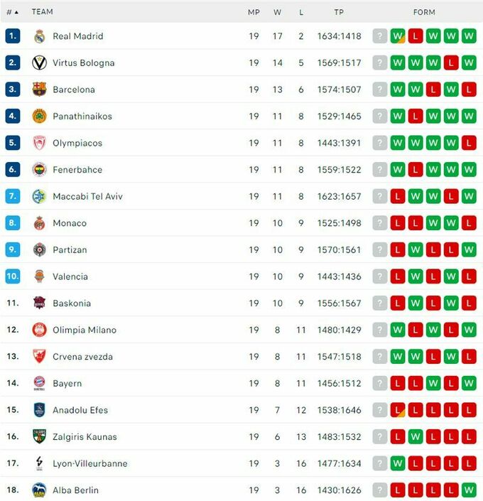 Евролига. Регулярный чемпионат, 19-й раунд. 5 января.