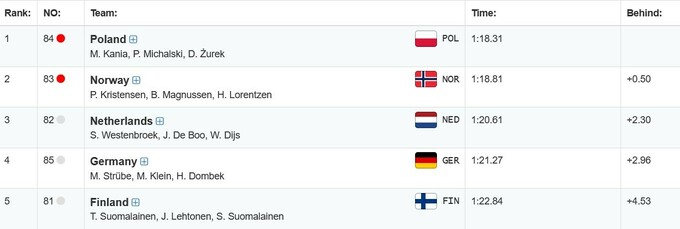 Свой чемпионский титул Марек Каня, Пьотр Михальски и Дамиан Зурек дополнили мировым рекордом для равнинных овалов - 1:18.31. Всего полсекунды полякам уступили норвежцы Пол Кристенсен, Бьорн Магнуссен и Ховард Лорентцен. Замкнули призовую тройку представители хозяев льда Стефан Вестенбрук, Йеннинг де Бо и Уэсли Дайс.