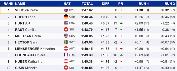 Второй стала немке Лена Дюрр, топ-3 сенсационно замкнула американка Эй Джей Харт. Лидер Кубка мира, Микаэла Шиффрин, сошла с дистанции еще на первой попытке.