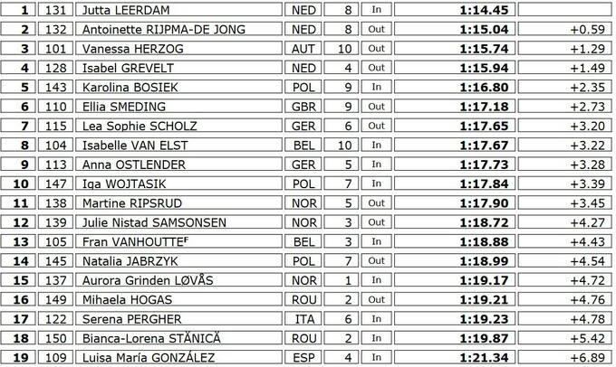Лидер сборной Нидерландов на домашнем льду арены «Тиалф» в Херенвене бежала в восьмой паре с еще одной фавориткой соревнований Антуанеттой Райпмой-Де Йонг. И в очном соревновании Лердам победила с отрывом в 0.59 секунды. Третье место заняла австрийка Ванесса Херцог, которая бежала в последней паре и во второй раз на чемпионате Европы 2024 поднялась на подиум.
