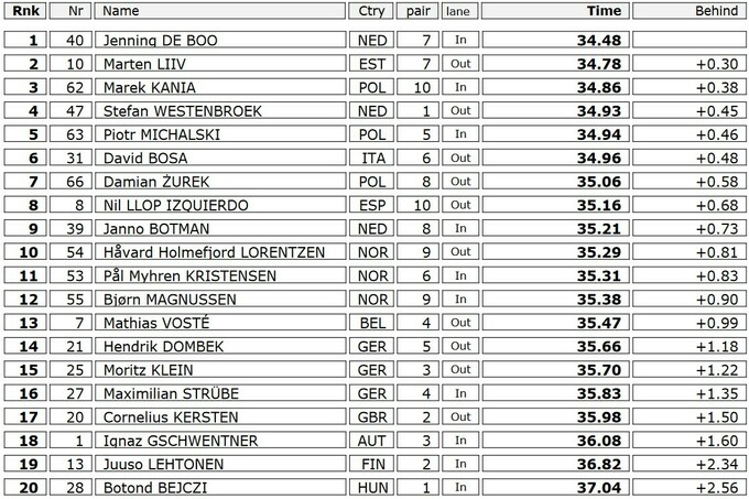 Де Бо вышел на лед в седьмой паре вместе с эстонцем Мартином Лийвом, который смог навязать ему борьбу, но на финише уступил 0.3 секунды. Третье место занял поляк Марек Каня, который после стартовой стометровки был первым, но опередить время Де Бо не смог.