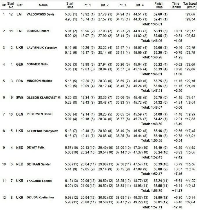 По итогам первого спуска Лавренюк показал второе время, проиграв лишь Давису Валдовскису из Латвии, однако во втором спуске украинец уступил еще одному латышу Ренарсу Юмикису, который по сумме двух спусков стал вторым. Валдовскис уверенно выиграл и второй спуск, и стал чемпионом мира среди юниоров U-20.