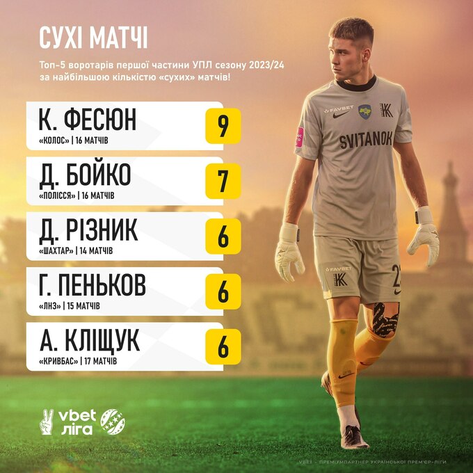 Топ-5 голкиперов по количеству сухих матчей в первой половине сезона УПЛ 2023/24: