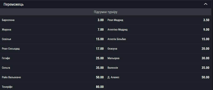 Главным претендентом на титул является «Барселона», которая проведет поединок против «Унионистоса». Коэффициент на победу каталонцев составляет 3.00.