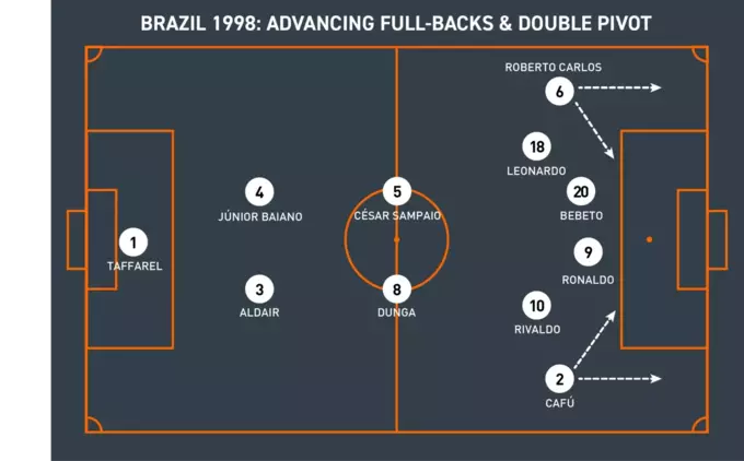 Также в отличие от команды 1970 года, команда Загалло образца 1998 года начинала атаку от вратаря. Умение Клаудио Таффарела держать мяч в ногах позволяло ему первым пасом найти любого центрального защитника – Алдаира или Жуниора Байано – или одного из центральных полузащитников. Если соперник прессинговал, у него хватало навыков для более длинного паса – форвардам, атакующим полузащитникам или даже крайним защитникам.