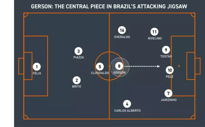 При столкновении с более структурированными атаками соперников Бразилия выстраивала более низкий блок и переходила к оборонительной схеме, больше напоминающей 4-4-1-1. Защитная четверка начинала действовать в нескольких метрах от штрафной площади, а Жерсон опускался в полузащиту к Клодоальдо, образуя дуэт. Ривелино и Жаирзиньо защищали широкие зоны, оставляя Тостао в роли стержня атаки, а Пеле – впереди. Когда они возвращали мяч себе, Жерсон был тем игроком, на которого они обращали внимание. Прекрасный технарь, он был способен начать быструю контратаку или удержать мяч, пока команда перестраивается в атакующую схему.