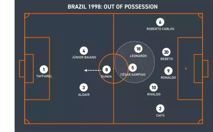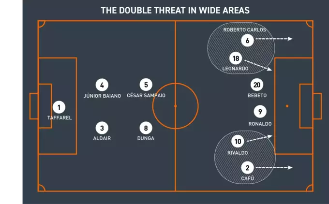 Против более организованных атак команда, как и в 1970 году, переходила на схему 4-4-1-1. В этом случае Ривалдо занимал позицию на правом фланге полузащиты. Однако если соперник не выставлял в атаку большое количество игроков, Ривалдо оставался выше, предлагая эффективную контратакующую опцию в поддержку Роналдо и Бебето.