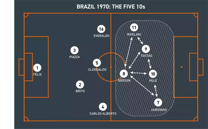 Перед Клодоальдо, единственным опорным полузащитником команды, Загалло выделил группу из пяти атакующих игроков, которые постоянно менялись позициями. Индивидуально Жерсон, Ривелино, Жаирзиньо, Тостао и, конечно же, Пеле были звездными игроками. В коллективе Загалло использовал так называемые «пять десяток» в динамичной, подвижной атакующей структуре. Защитники соперников никогда не видели ничего подобного.