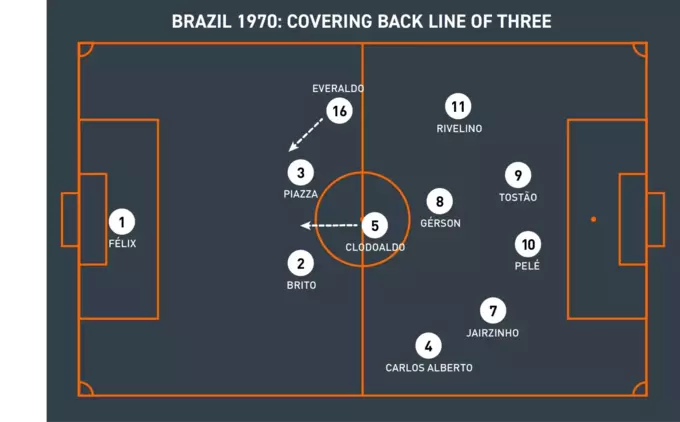 Загалло также хотел играть максимально плотно в оборонительной фазе. Когда команда переходила на половину поля соперника, защитная линия из трех человек – оба центральных защитника и, как правило, Эверальдо, менее атакующий фланговый защитник – выдвигалась вперед до линии полузащиты. Клодоальдо обычно располагался прямо перед ними.