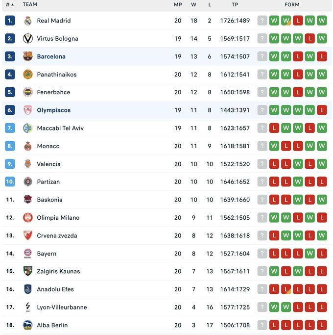 Евролига. Регулярный чемпионат, 20-й раунд. 9 января.