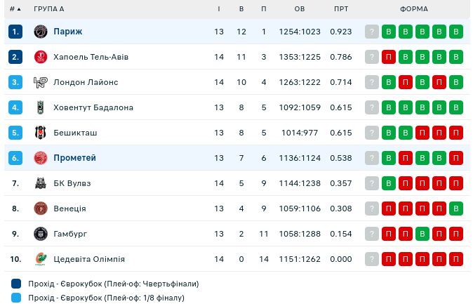 Парижская команда является очевидным фаворитом группы А, выиграв 12 матчей и проиграв только один. Более того, и в группе В нет команды с лучшими показателями. В восьми из тринадцати матчей «Париж» набирал более 100 очков в матче. «Прометей» же идет по дистанции натужно, чередуя победы с поражениями и занимая сейчас только последнее проходное шестое место в группе. Первая игра между командами закончилась уверенной победой «Парижа» со счетом 96:79.