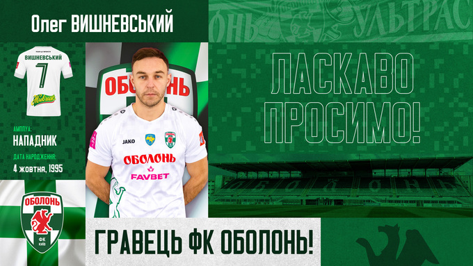 Также свою подпись под соглашением с «Оболонью» поставил нападающий Олег Вишневский, последним клубом которого был «Минай». В первой половине сезона форвард провел за закарпатцев 12 матчей в УПЛ, мячей не забивал.