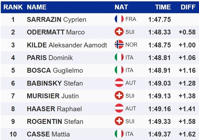 Французский горнолыжник Сиприен Сарразен выиграл супергигант на этапе Кубка мира в швейцарском Венгене. Он опередил победителя вчерашнего скоростного спуска Марко Одерматта и норвежца Александера Омодта Килде.