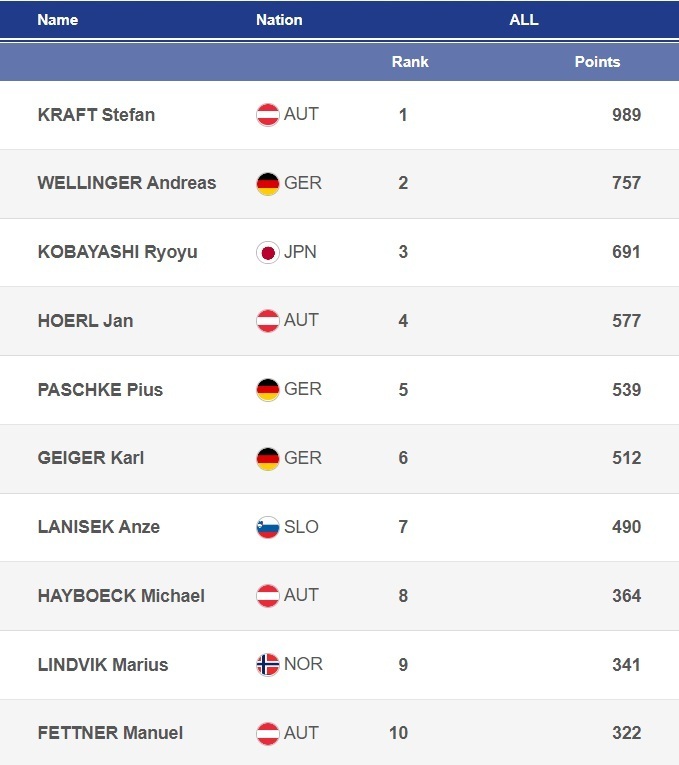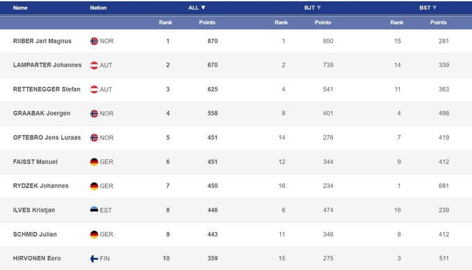 Так или иначе, по итогам этапа в Оберстдорфе Риибер заметно упрочил свое лидерство в общем зачете Кубка мира. Связано это во многом с тем, что после второго места в субботу не вышел на старт гонки в воскресенье ближайший преследователь Риибера, Йоханнес Лампартер. Австрийцу во время новогодних каникул делали операцию по удалению зуба мудрости, он сидит на антибиотиках, и в воскресенье чувствовал себя плохо.