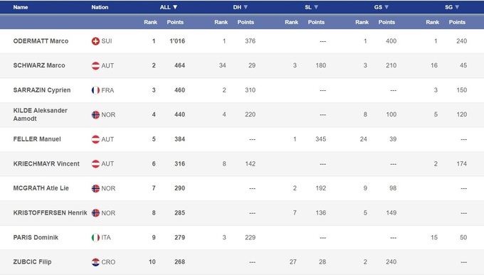 То, что Одерматт и Сарразен находились в отдельной лиге, сказано не для красного словца, и не является преувеличением. Во всех гонках они имели существенный отрыв над остальными. Наиболее ярко это проявилось в субботнем скоростном спуске по полной длине «Лауберхорна»: Доминик Парис, который финишировал третьим, проиграл Одерматту 1,92 секунды!