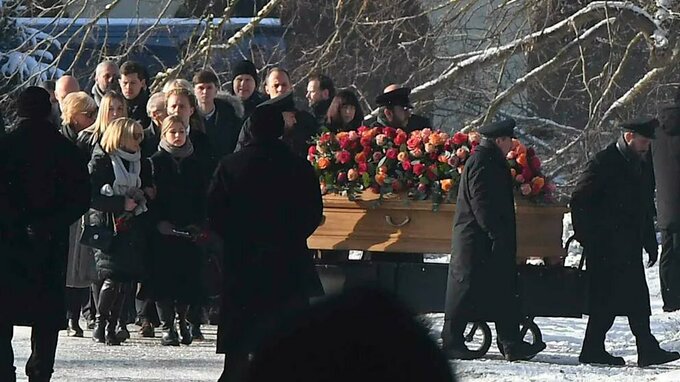 На фотографиях видно, как гроб Беккенбауэра, покрытый цветами, проносят по заснеженному кладбищу.