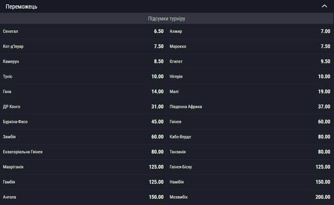 Букмекеры назвали главного претендента на титул – Сенегал. На победу Садио Мане и компании можно поставить с коэффициентом 6.00. На втором месте – Алжир (7.00), а третье и четвертое места делят Кот-д'Ивуар и Марокко (7.50).