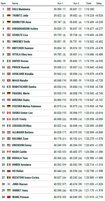 Эгле уверенно выиграла первый спуск, став единственной саночницей, которая выехала из 39.6 секунд. Во втором спуске австрийка проехала немного медленнее, но выиграла его, и второй подряд этап Кубка мира. Второе место также без проблем заняла немка Юлия Таубитц, а борьбу за третье место выиграла Анна Беррайтер, которая второй спуск проехала хуже, чем американка Эшли Фаркуарсон, но достаточно для того, чтобы по сумме стать третьей.