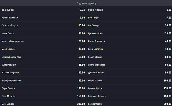 Что касается украинок, то наивысшие шансы у первой ракетки страны Элины Свитолиной (40.00). Она – 10-12-я фаворитка. Марта Костюк с котировками в 100.00 находится выше Ангелины Калининой, Леси Цуренко и наших «квалифаерок». На их титул коэффициент составляет 500.00.