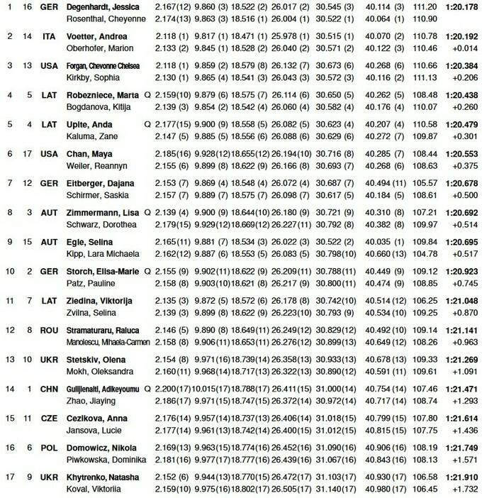 После первого спуска Дегенхардт и Розенталь были третьими, но второй спуск проехали на полсекунды быстрее и это позволило немкам выиграть по сумме двух спусков. Второе место заняли итальянки Андреа Феттер и Марион Оберхофер, а замкнули призовую тройку Шефонна Форган и София Киркби из США.