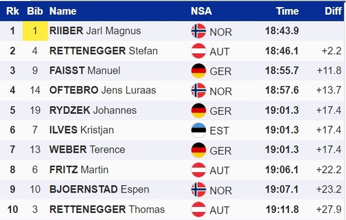 Победу одержал лидер Кубка мира Ярл Магнус Риибер, который опередил австрийца Штефана Реттенэггера и немца Мануэля Файсста. Вице-лидер Кубка мира Йоханнес Лампартер не вышел на старт гонки.
