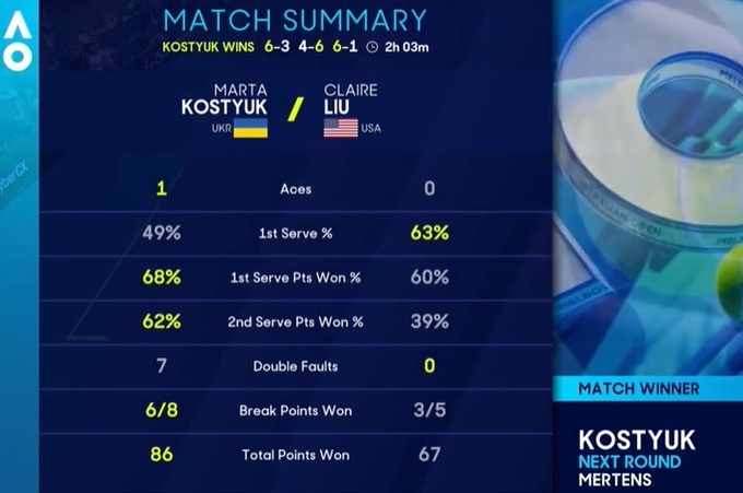 Украинская теннисистка Марта Костюк (№37 WTA) успешно начала борьбу в основной сетке Открытого чемпионата Австралии по теннису.