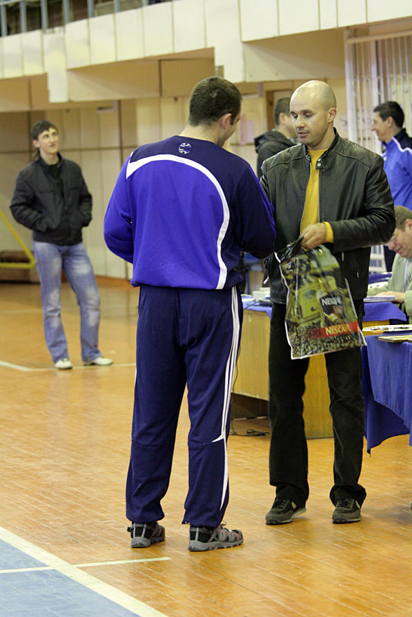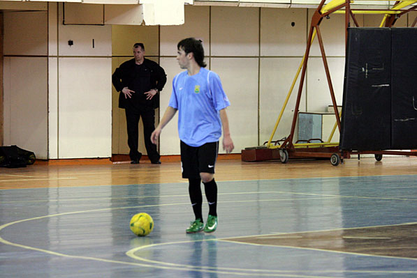 С мячом лучший бомбардир турнира ФПЛ - Сергей Конопчук. Удаленный Игорь Будзько не мог спокойно сидеть на трибуне, потому заглядывал в зал то из одной, то из другой раздевалок