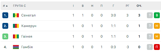 В группе С лидирует сборная Сенегала (3 очка), которая обыграла Гамбию (3:0). Камерун и Гвинея набрали по одному очку.