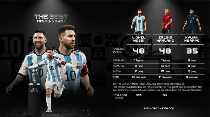 После завершения церемонии ФИФА обнародовала результаты голосований. Месси и Холанд набрали одинаковое количество баллов, однако благодаря тому, что большое количество капитанов выбрало аргентинского форварда, именно Лео выиграл эту награду.