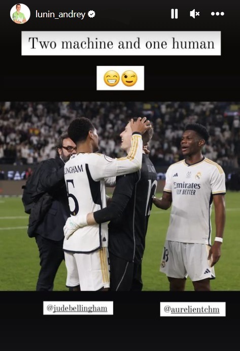 Украинский голкипер мадридского «Реала» Андрей Лунин после победы команды над «Барселоной» в финале Суперкубка Испании (4:1) поделился с подписчиками в сториз Инстаграма фотографией, на которой запечатлен он вместе с Джудом Беллингемом и Орельеном Тчуамени.