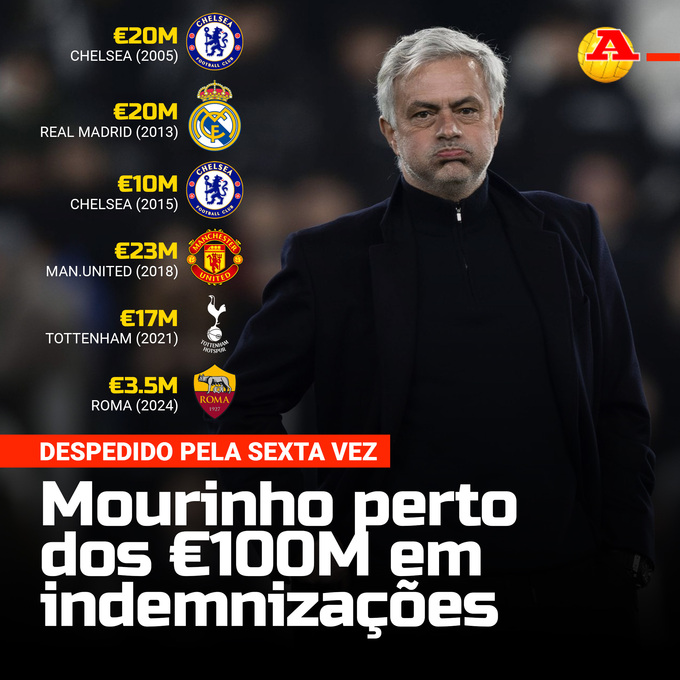 Португальское издание A Bola подсчитало, сколько Моуриньо заработал на компенсациях после увольнений. С Жозе шесть раз за карьеру досрочно разрывали отношения – дважды «Челси» и по одному разу «Реал», «Манчестер Юнайтед», «Тоттенхэм» и «Рома». За эти увольнения португальский тренер получил около 100 миллионов евро компенсаций.