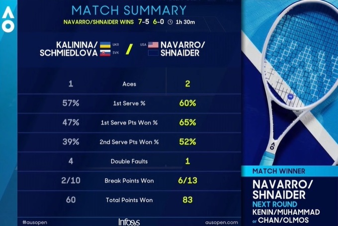 У Наварро и Шнайдер далее победительницы встречи София Кенин / Ейжа Мухаммад – Чан Хао-Чин / Джулиана Олмос.
