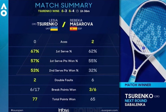 Это была первая встреча теннисисток. Цуренко повторила свое лучшее достижение на австралийском мейджоре, в 2013-м Леся также прошла два первых круга.