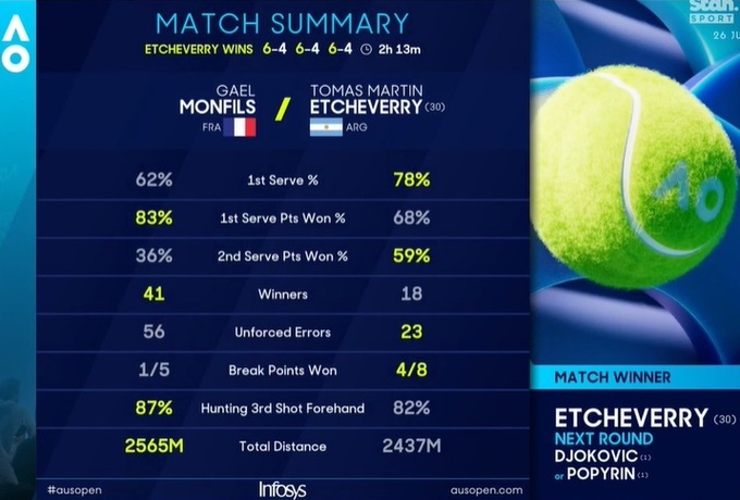 В следующем раунде Этчеверри сыграет против Новака Джоковича (№1 ATP) или Алексея Попырина (№43 ATP).