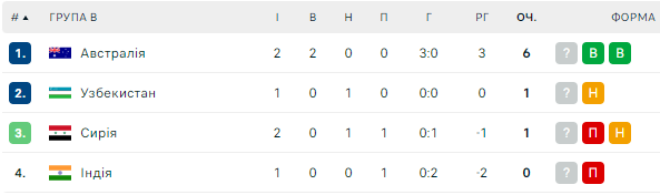 Сборные Узбекистана и Сирии имеют по одному очку, Индия свой первый матч проиграла.