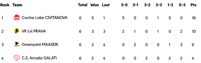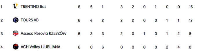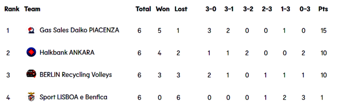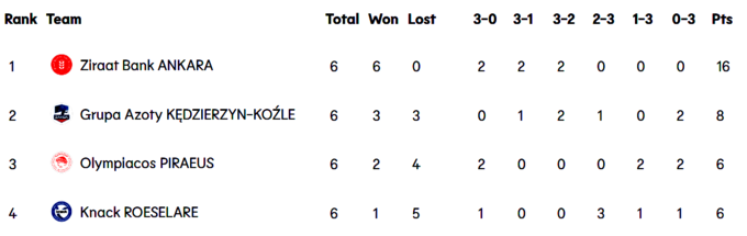 Так, в группе А первое место занял турецкий «Зираат Банкасы», который стал единственным клубом выигравшим все свои поединки. По 5 побед одержали итальянские «Трентино» (группа В), «Пьяченца» (группа С) и «Кучине Лубе» (группа Е). Еще одним участником 1/4 финала стала польская команда «Ястшембски Вегель» (группа D).