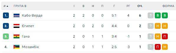 Кабо-Верде с двумя победами набрал 6 очков и досрочно вышел в плей-офф КАН. Далее идут: Египет (2), Гана и Мозамбик (по 1).