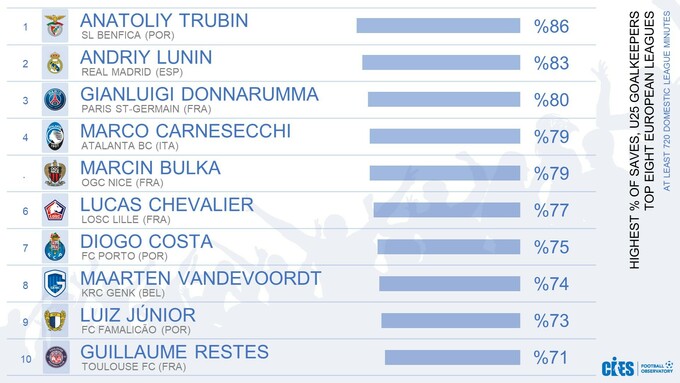 CIES (Международный центр спортивных исследований) опубликовал рейтинг лучших вратарей (до 25 лет) топ-8 европейских чемпионатов по проценту сейвов.