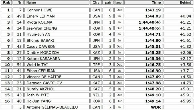 В мужской гонке японец Рета Кодзима вышел на лед первым и сразу поставил время, которое казалось недосягаемым для других конькобежцев. Но в предпоследней, восьмой паре 23-летний Коннор Хау из Канады снял с результата Кодзимы почти полторы секунды и одержал убедительную победу. При этом канадец стал единственным, кто смог выбежать из 1 минуты и 44 секунд. Интересно, что Хау выступал на чемпионате четырех континентов впервые в карьере. А в последней паре на лед вышел местный спортсмен Эмери Леман. К результату Хау он приблизиться не смог, но отправил японского конькобежца на третье место, опередив его время почти на секунду. Интересно, что Кодзима мог даже не попасть на подиум — кореец Чхан Дже Вон, который бежал в паре с Леманом, проиграл японцу 0.002 секунды.
