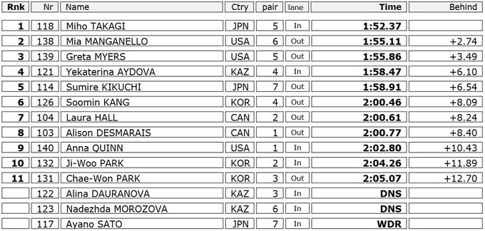 Женскую гонку выиграла мировая рекордсменка и абсолютная лидер сезона 2023/24 на этой дистанции Михо Такаги. На чемпионате четырех континентов она также была недосягаема для соперниц с результатом 1:52.37, своим лучшим временем в нынешнем сезоне. Опытная Миа Манжанелло, которая заняла второе место, проиграла японке 2.74 секунды. Для 34-летней американки этот подиум стал пятым в карьере на чемпионатах четырех континентов. А третье место заняла еще одна спортсменка из США, 19-летняя Грета Майерс, которая установила личный рекорд на этой дистанции, 1:55.86, и выиграла медаль такого уровня впервые в карьере.