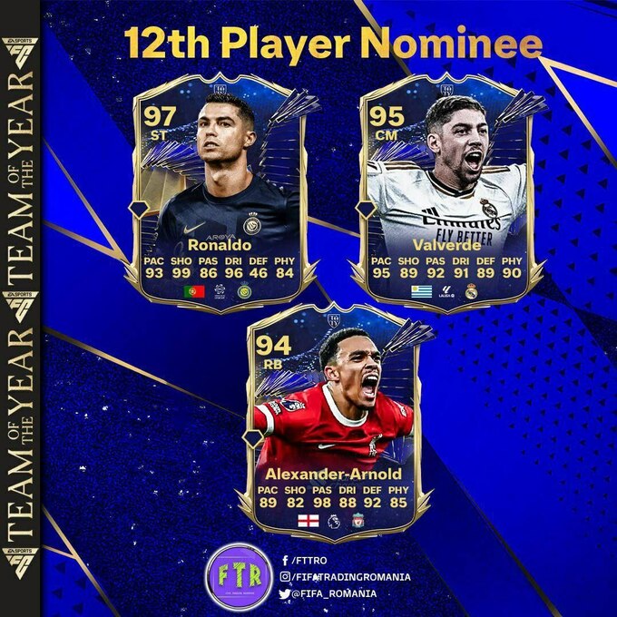 Кроме 11 основных футболистов, добавится еще и 12-й игрок. На это место претендуют Криштиану Роналду (НАП, Аль-Наср), Федерико Вальверде (ЦП, Реал Мадрид) и Трент Александер-Арнольд (ПЗ, Ливерпуль). 12-го футболиста выберут за подсчетом голосов обычных игроков в EA FC 24.