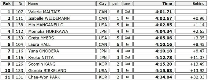 По итогу гонки на самую длинную дистанцию в программе женских соревнований канадки сделали чемпионский дубль. Но при этом Мальте опередила Исабелль Вейдманн, которая бежала первой и одна, почти на секунду. Замкнула первую тройку американка Миа Манжанелло. Ее партнерша в паре Грета Майерс в середине дистанции шла по графику первого места, но не смогла удержать темп и финишировала с пятым временем и личным рекордом.