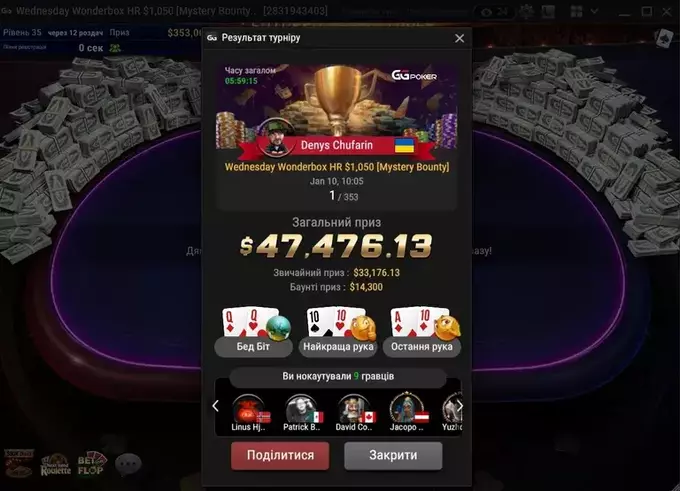 Игра была чрезвычайно напряженной, Денис имел один из самых маленьких стеков, но выиграл префлоп и стал лидером за финальным столом. Украинец выбил Якопа Оливьера и получил 9 600 долларов за самый большой нокаут. За свою победу украинский игрок получил 47 476 долларов, с учетом баунти в размере 14 300 долларов. Турнир проходил на платформе GGPoker.