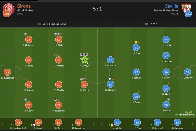 Форвард «Жироны» Артем Довбик вышел в стартовом составе и выстрелил хет-триком в первом тайме. Для Артема это первый хет-трик в Ла Лиге, он провел на поле 73 минуты и был заменен. Авторитетный статистический портал WhoScored признал украинского голеадора лучшим игроком матча, поставив ему отметку в 9.7 баллов.