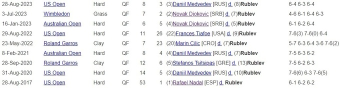 Предыдущие 9 матчей 1/4 финала на мейджорах с участием Рублева